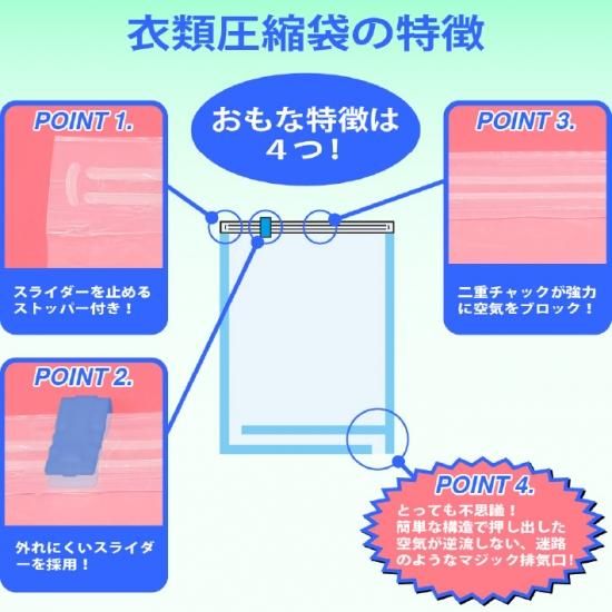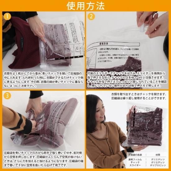 衣類用の圧縮袋はサイズの異なる4製品を販売しています。また、衣類用以外に、掃除機で圧縮できるふとん用の圧縮袋も3製品を販売しています。ふとん圧縮袋の方も、押し入れの中で場所を占めているふとんを約1/4に圧縮することができますので、押し入れの有効活用にお勧めです。
